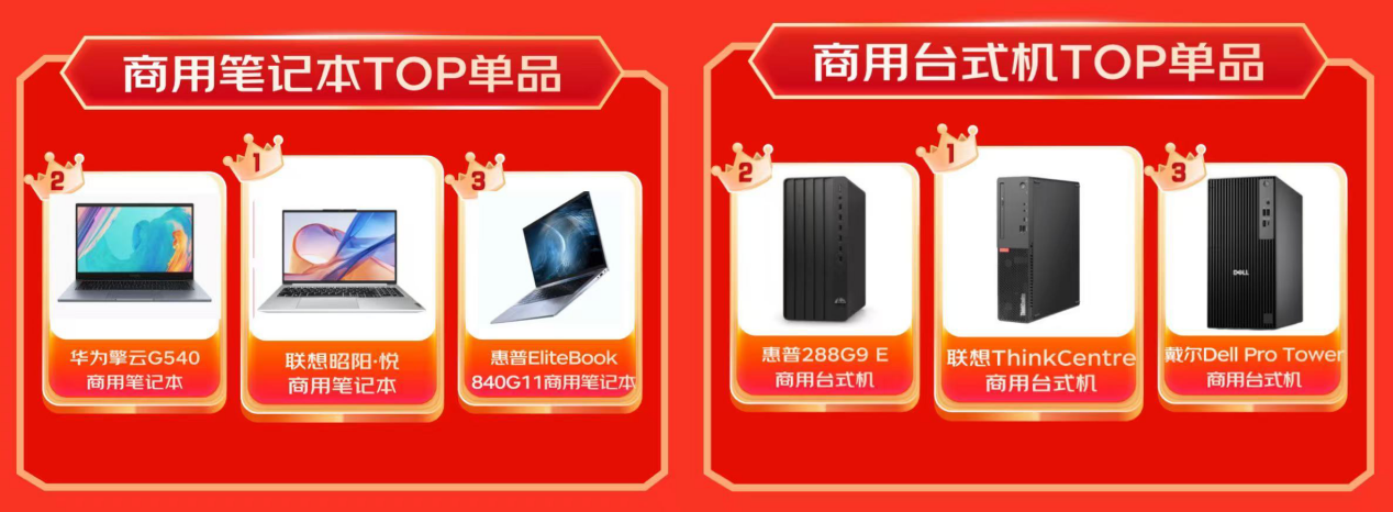 TOP单品榜单则精确形容了刻下企业采购爆款新趋势。在商用条记本TOP单品中,梦想昭阳·悦商用条记本、华为擎云G540商用条记本、惠普EliteBook 840G11商用条记本成为最受企业用户接待的机型。商用台式机TOP3单品则由梦想ThinkCentre商用台式机、惠普288G9 E商用台式机、戴尔Dell Pro Tower商用台式机包揽。