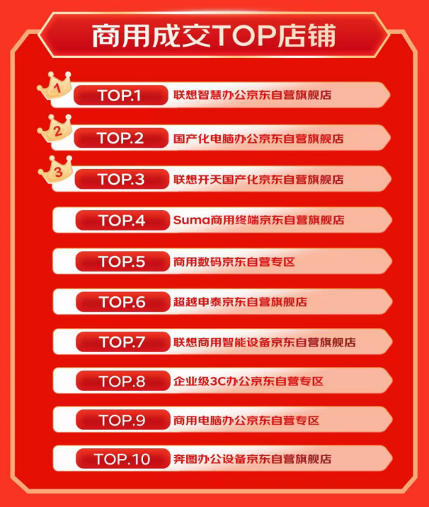 此外,从店铺维度来看,商用成交店铺TOP3由梦想智谋办公京东自营旗舰店、国产化电脑办公京东自营旗舰店、梦想开天堂产化京东自营旗舰店一举拿下。Suma商用终局京东自营旗舰店、商用数码京东自营专区等店铺也凭借高效、智能的采购体验踏进成交店铺TOP10榜单,成为广受企业客户相信的采购选择。