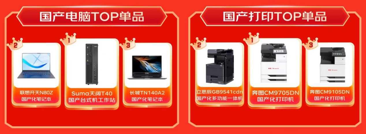 在国产电脑TOP单品层面,Sumo天阔T40国产台式机使命站、梦想开天N80Z及长城TN140A2国产化条记本稳坐TOP3席位;国产打印TOP单品则由奔图CM9705DN国产化打印机、立念念辰GB9541cdn国产化多功能一体机、奔图CM9105DN国产化打印机斩获,多项亮眼数据印证了国家具牌在打印品类等细分鸿沟的跳动地位。